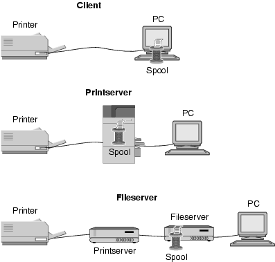 The printer can be physically cabled to the PC running the Network OS. Print jobs are submitted by clients to the printserver software on the fileserver, which sends them down the parallel or serial cable to the printer. The printer must be physically close to the fileserver. This kind of printserving is popular in smaller workgroup networks, in smaller offices.